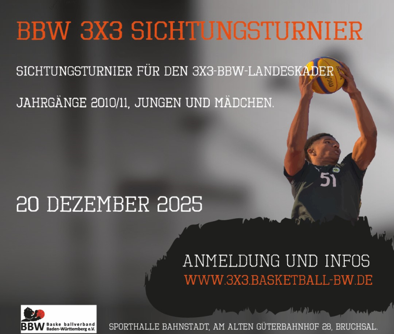 Nachdem im Dezember letzten Jahres das erste 3x3-Sichtungsturnier mit fast 100 Teilnehmerinnen erfolgreich durchgeführt wurde, möchte der BBW dieses Format beibehalten und veranstaltet auch in diesem Jahr erneut ein 3x3-Sichtungsturnier. Ziel ist es, interessante Spielerinnen für den 3x3 Landeskader zu entdecken.