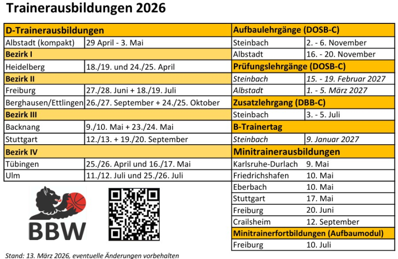 14.01.2026 Vom 21. bis 23. November 2025 und vom 2. bis 4. Januar 2026 fanden wieder die zwei zentralen BBW-Trainerfortbildungen an der Sportschule Steinbach statt.