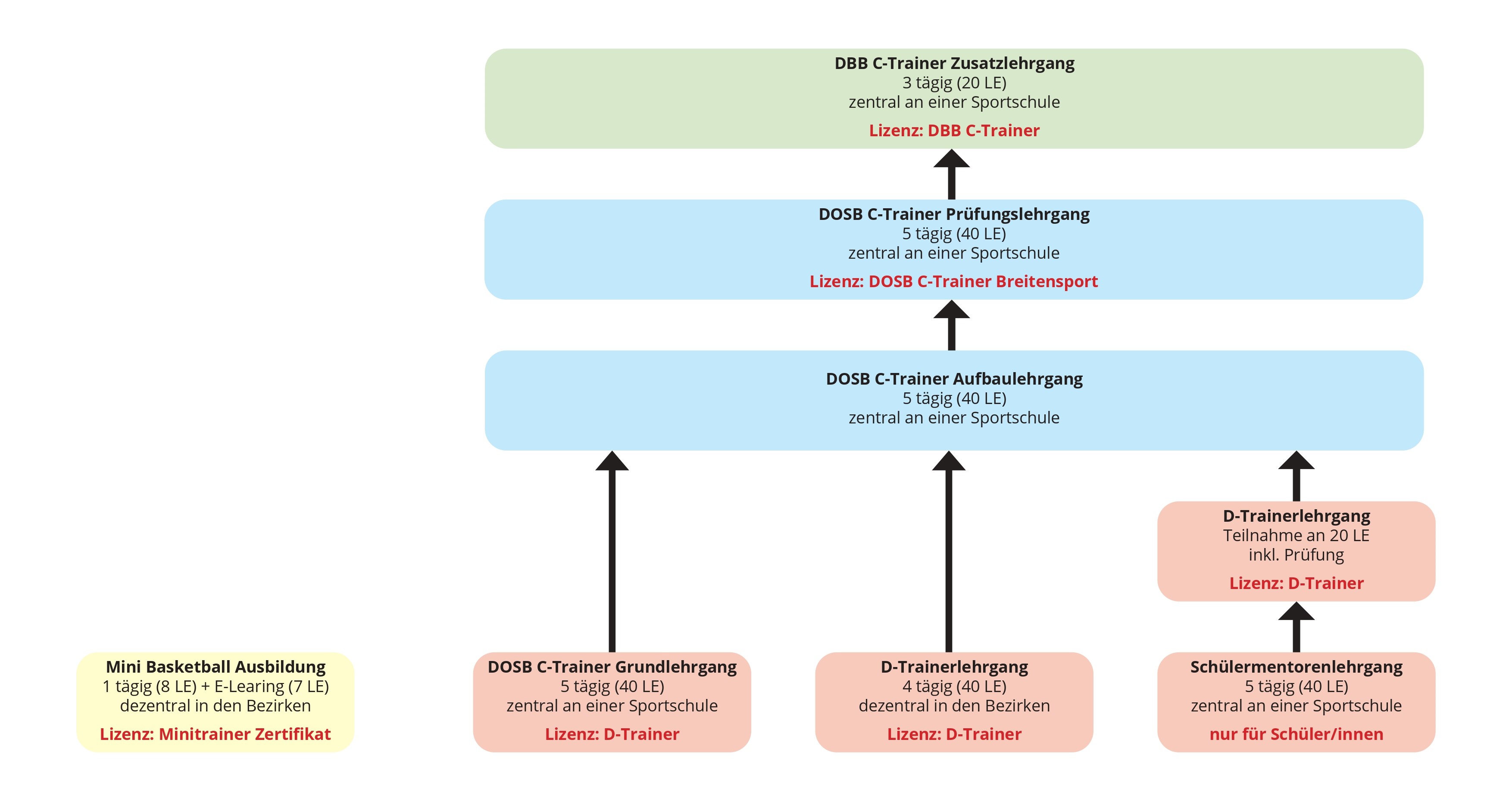 - DBB-Trainer C: als Befähigungsnachweis, leistungsorientierte Jugend- und Seniorenmannschaften bis einschließlich Regionalliga selbstständig aufzubauen, zu trainieren und zu betreuen.